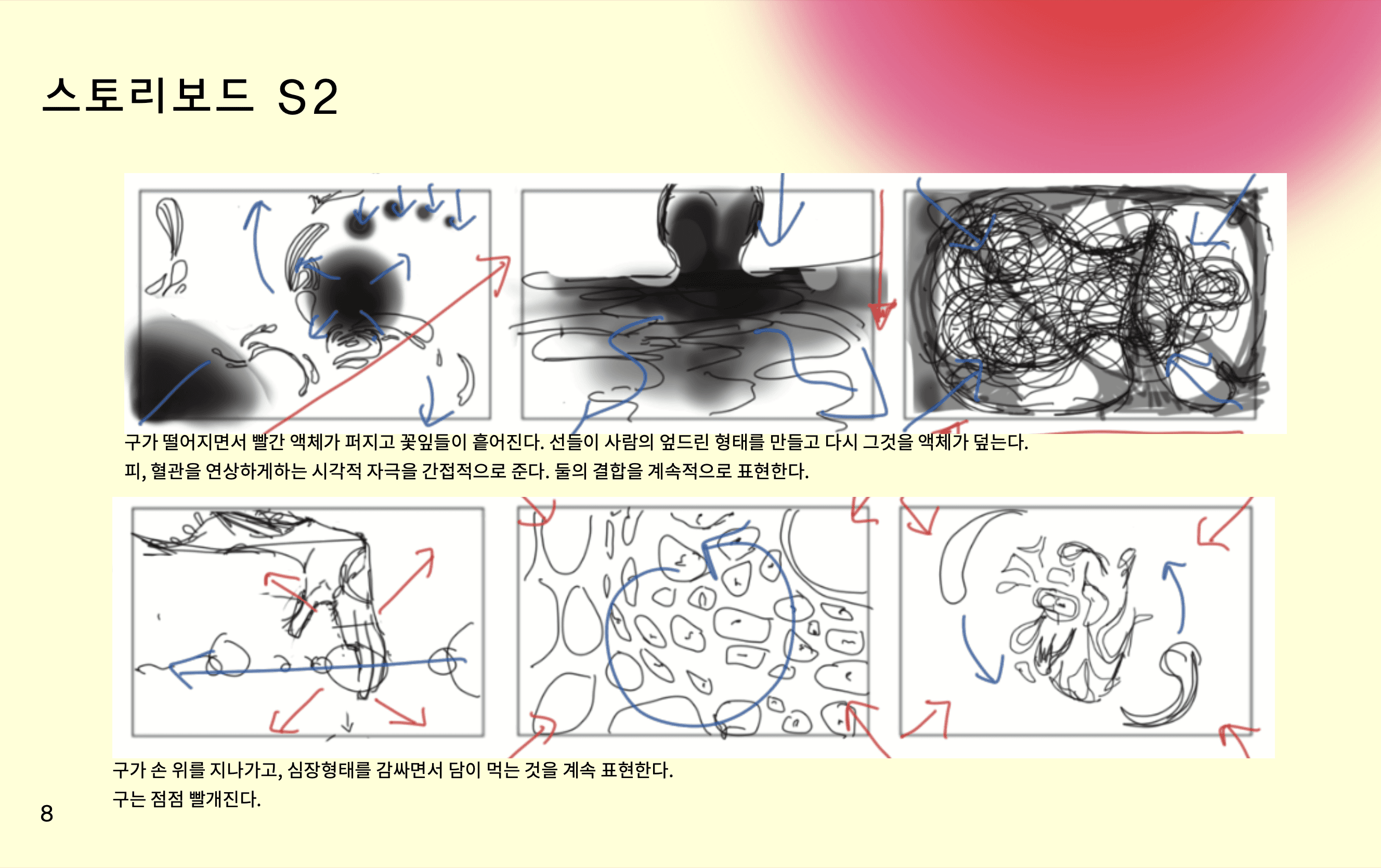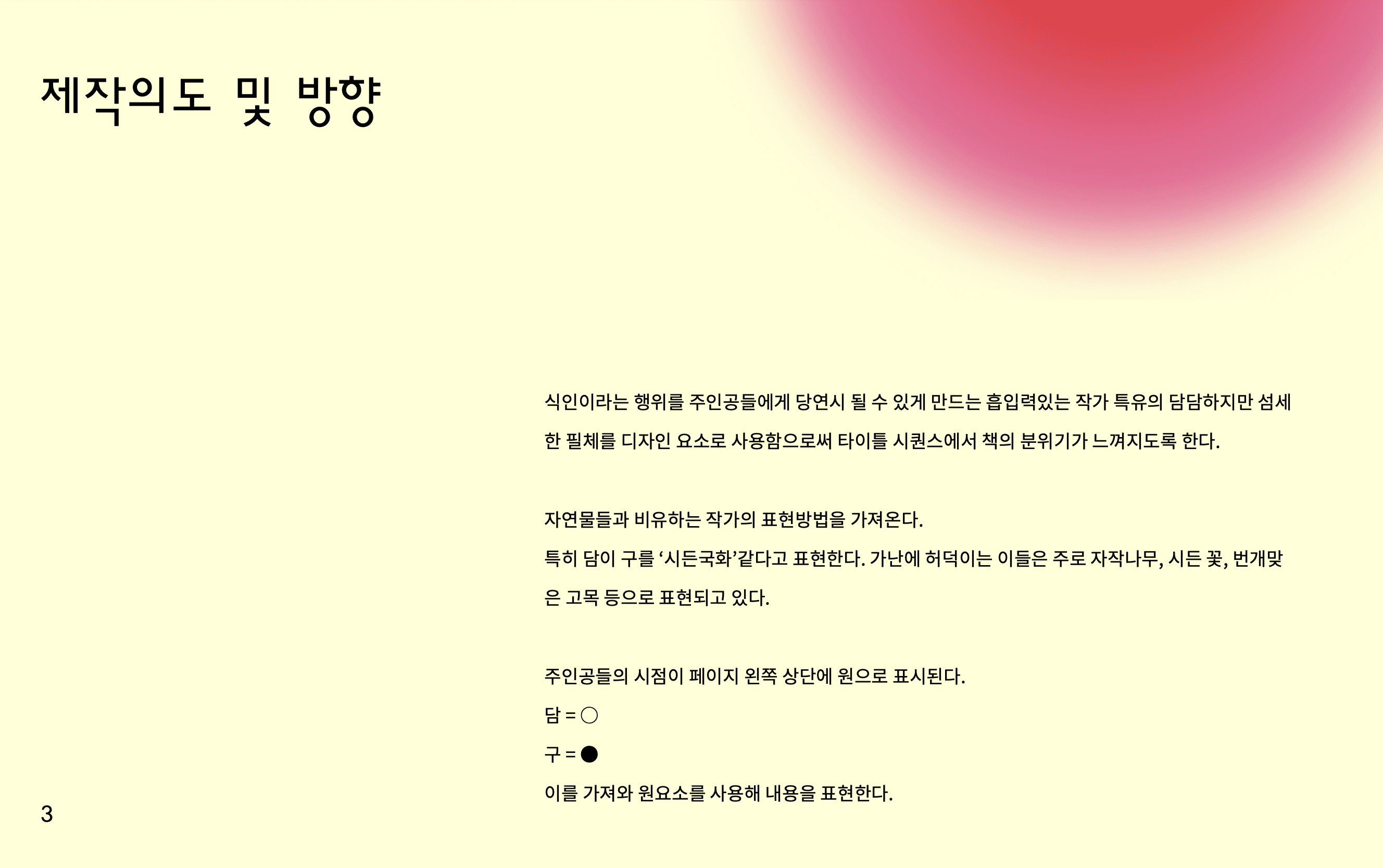 사랑하는 연인의 시체를 먹어서라도 영원히 함께하고자 하는 주인공 '담'의 처절한 사랑을 시각화했다. 엽기적일 수 있는 식인이라는 행위를 시각적으로 승화하기 위해, 서로에게 서서히 물들어가는 번 짐과 액체의 물성을 메인 컨셉으로 잡았다.