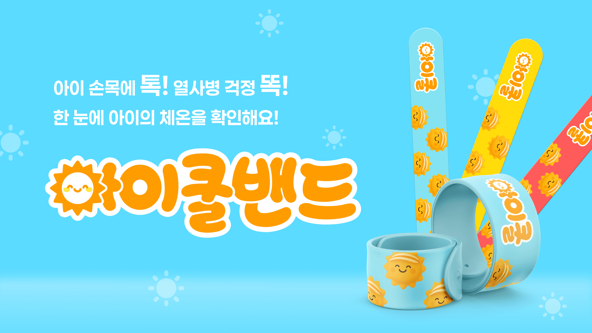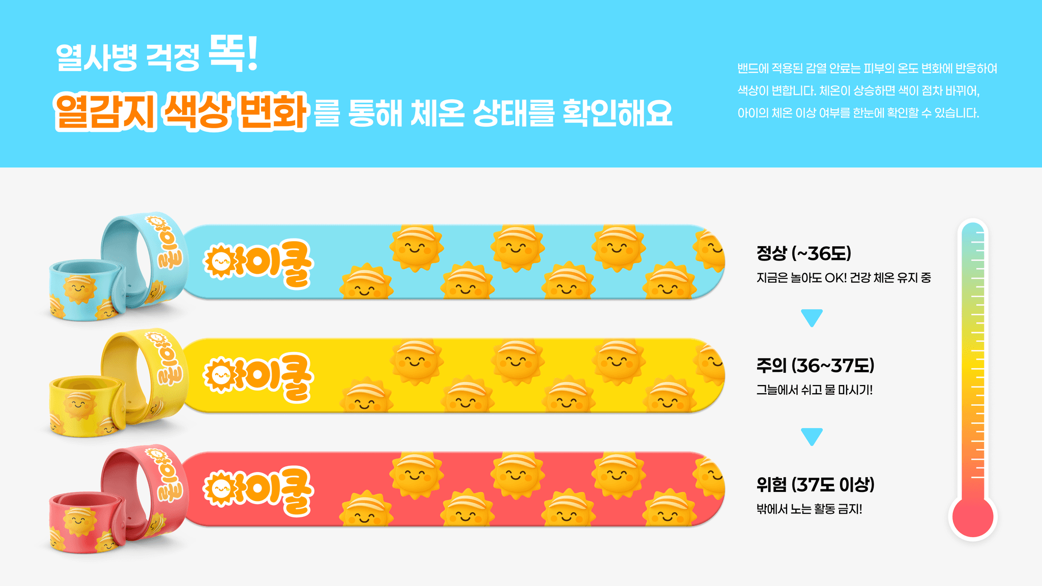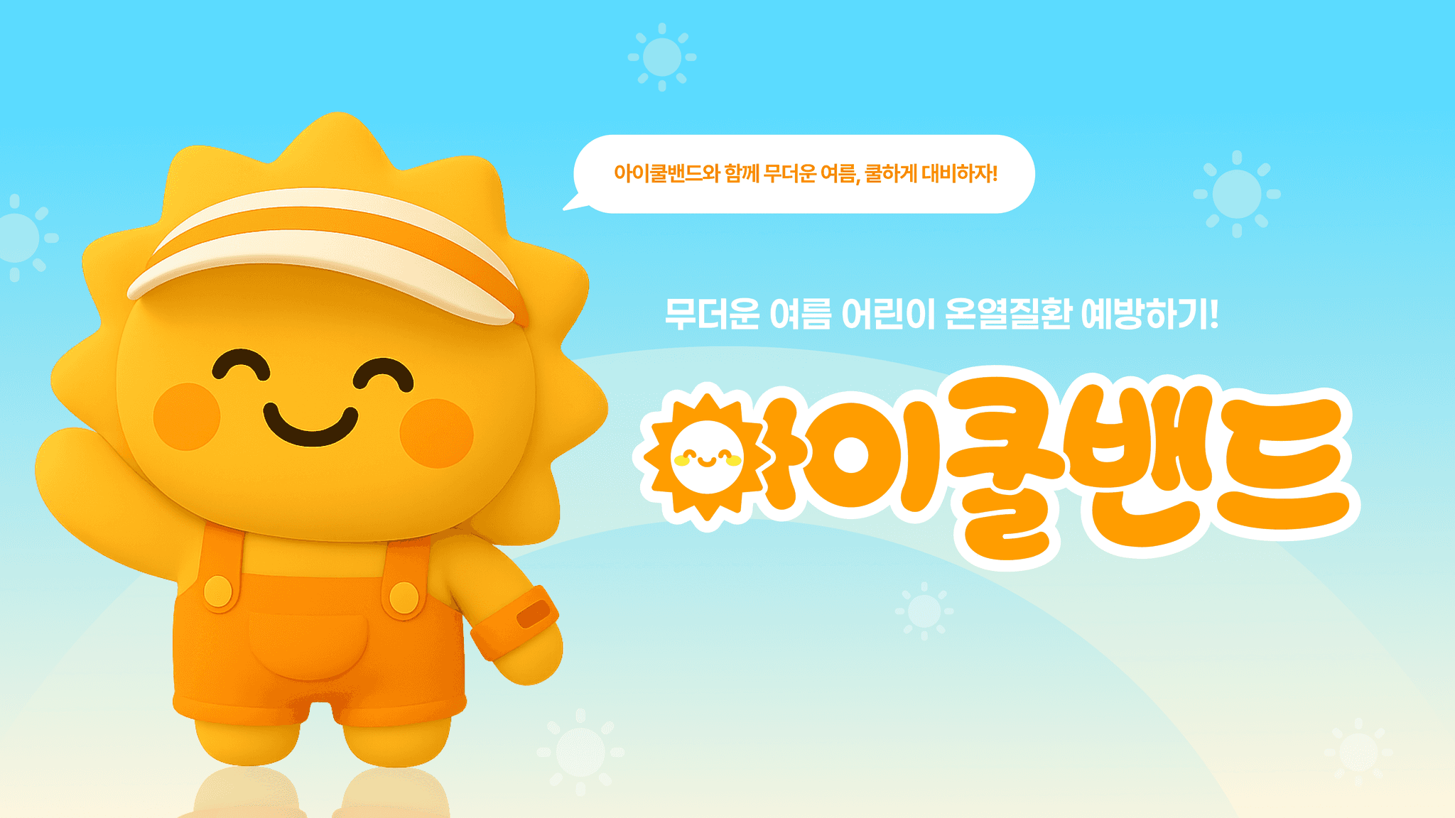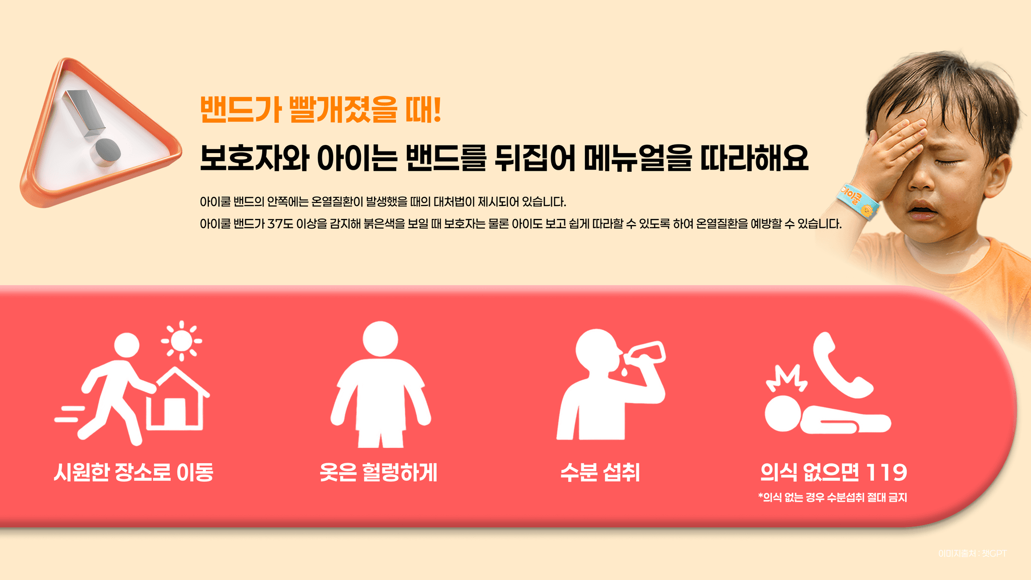 아이의 체온 변화를 직관적으로 알려주는 손목 밴드 아이쿨밴드를 중심으로, 온열질환 예방과 초기 대응 과정을 한눈에 전달하는 어린이 온열질환 예방 캠페인이다.