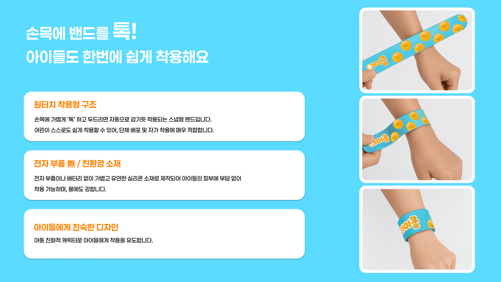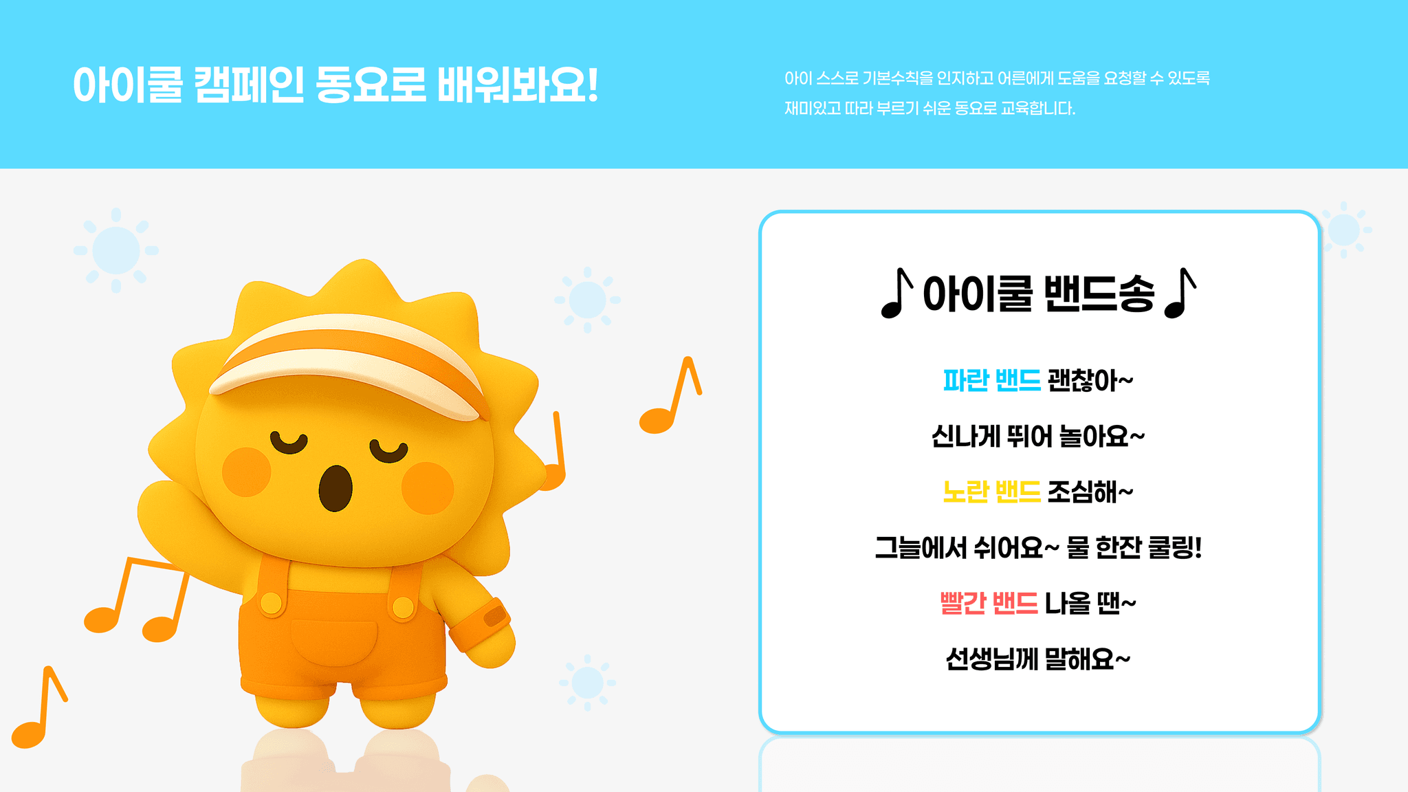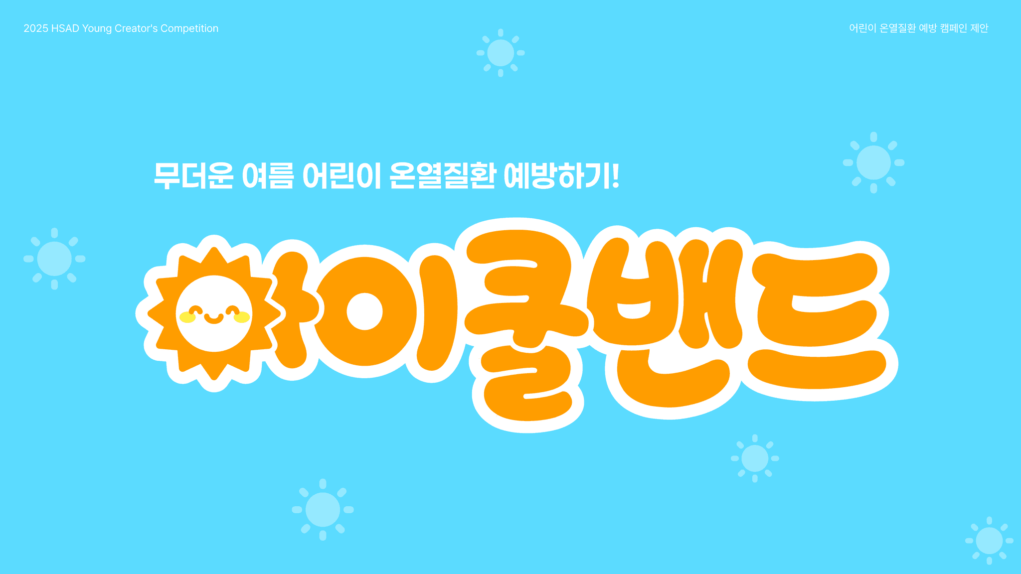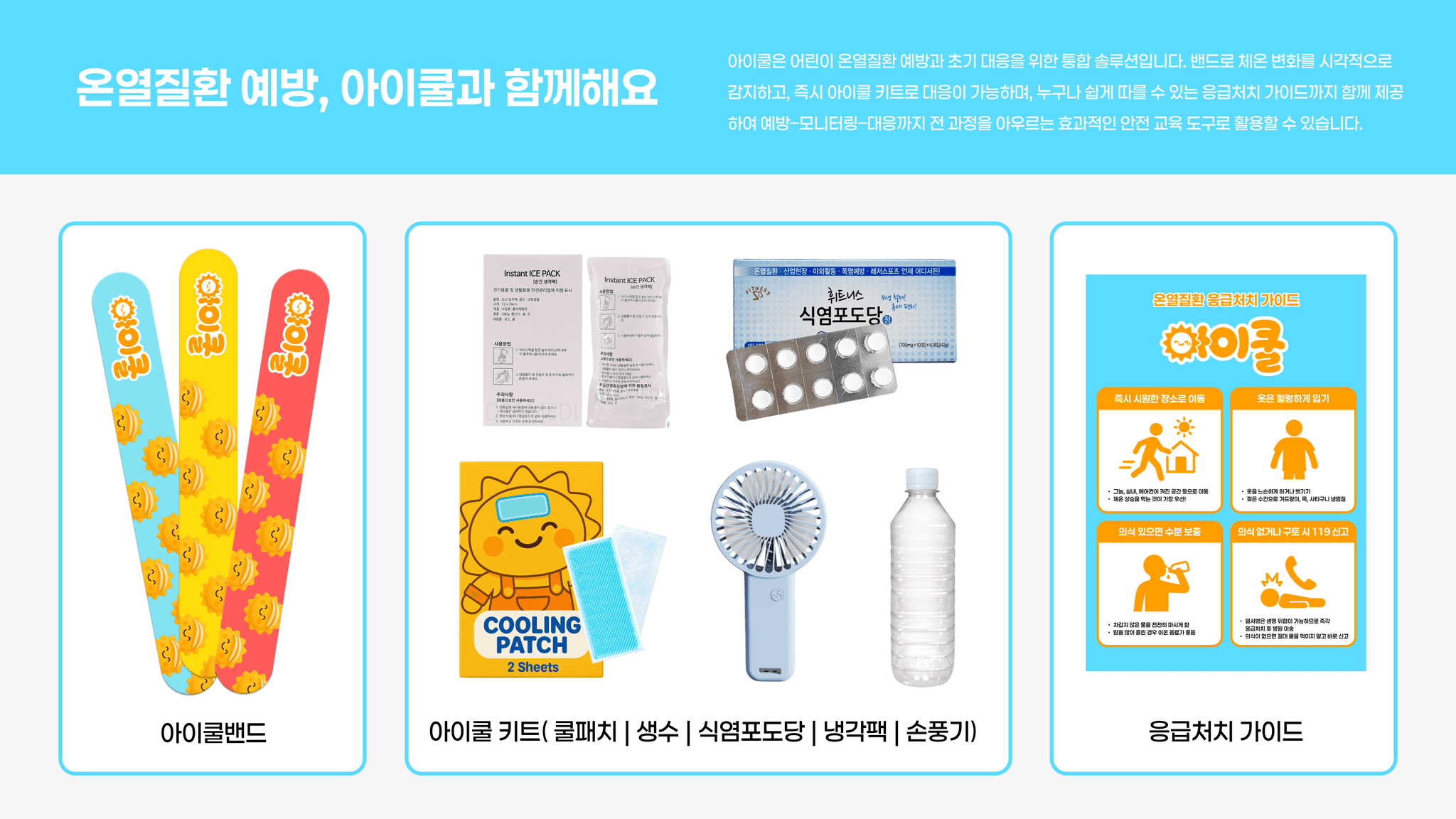 아이의 체온 변화를 직관적으로 알려주는 손목 밴드 아이쿨밴드를 중심으로, 온열질환 예방과 초기 대응 과정을 한눈에 전달하는 어린이 온열질환 예방 캠페인이다.