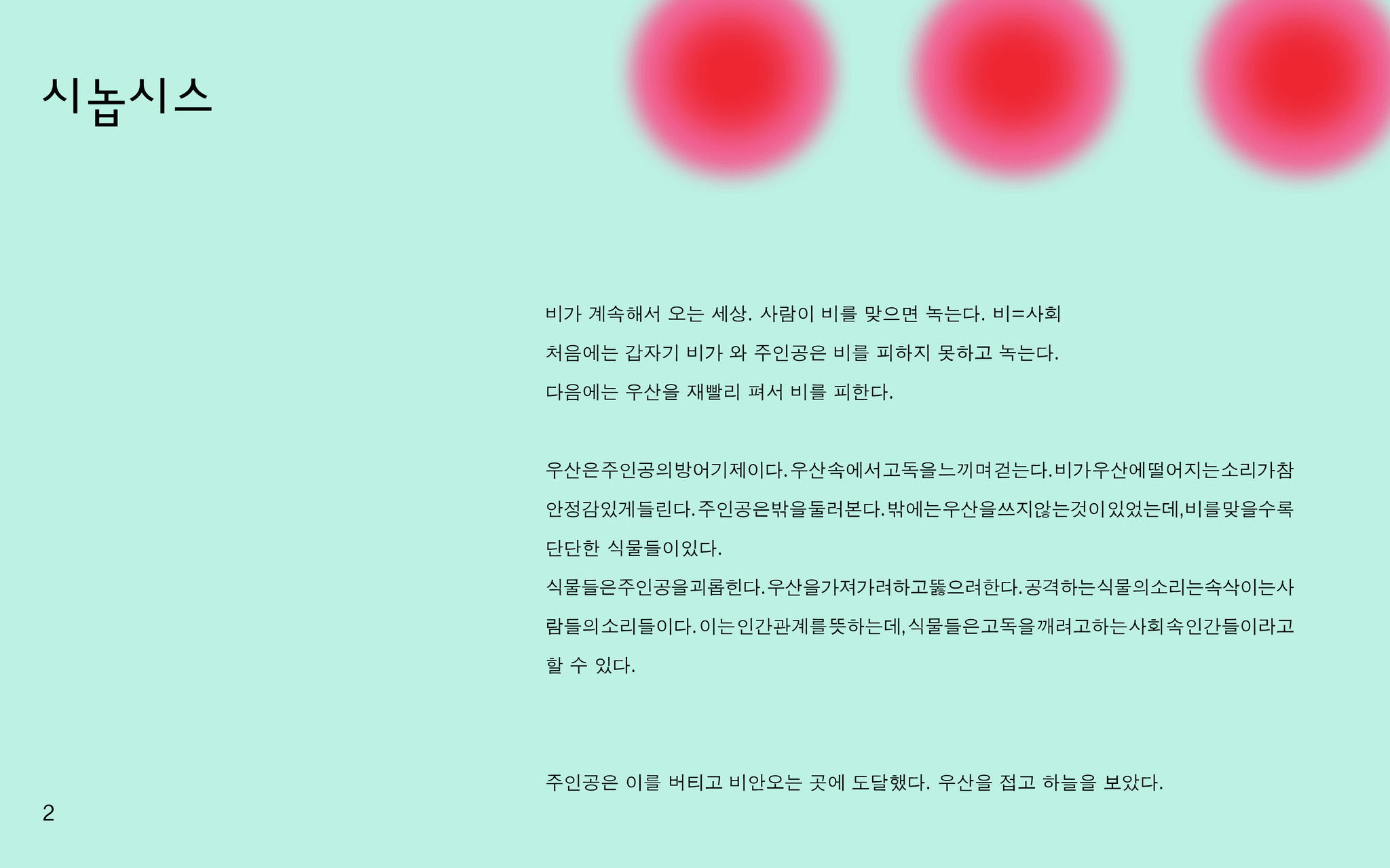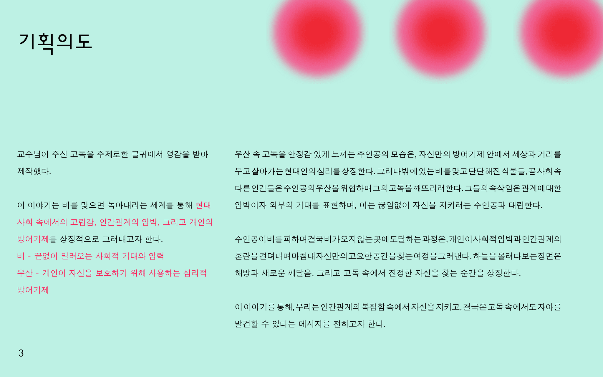 [The Melting World]는 끊임없이 비가 내리는 세상에서 사회적 압박과 인간의 고독, 그리고 방어기제를 다룬 상징적인 이야기를 녹여낸 가상 휴먼 다큐멘터리이다.