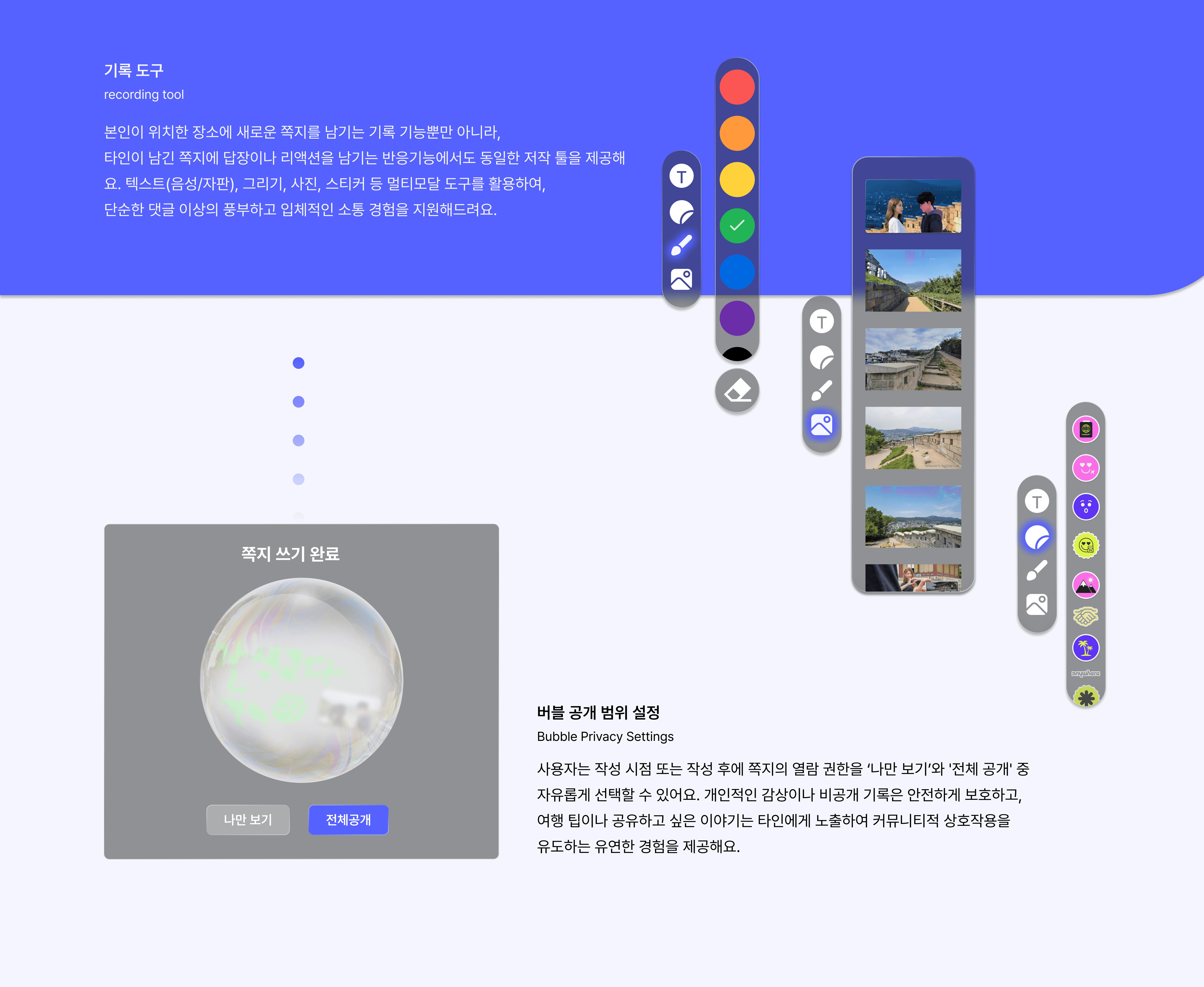 사용자의 취향에 맞춘 콘텐츠 및 여행장소 추천으로 개인화된 새로운 경험을 할 수 있다. 카메라 속 현실 배경에 영화·드라마 장면을 오버레이 하는 몰입형 AR 뷰를 통해 시공간을 초월한 생생한 감동을 전달한다. 손쉬운 제스처만으로 혼자서도 나만의 인생샷을 남겨 여행의 깊은 여운을 안전하고 편리하게 간직할 수 있도록 설계했다.
